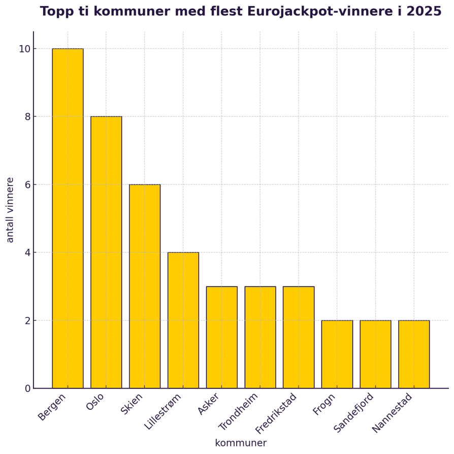 I 2024 var det Oslo som hadde flest millionvinnere (9), foran nettopp Bergen (8) – og Asker (6).
