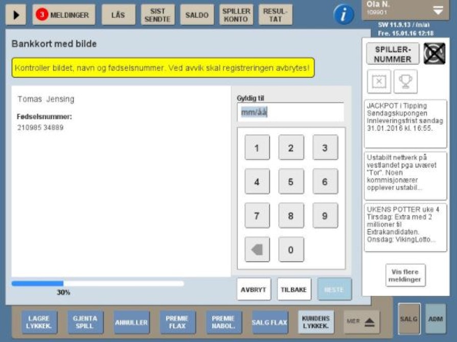 Kunden må deretter identifisere seg med enten bankkort, førerkort eller pass. Du må sjekke at alle opplysninger stemmer med kunden som står foran deg med det som er oppgitt. Slik ser det ut ved identifisering med bankkort.