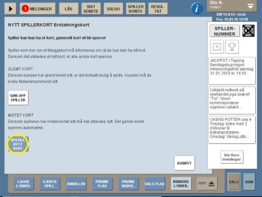 Dersom kunden har mistet Spillerkortet sitt er det mulig å utstede et nytt kort på terminalen. Husk at det er mulig å spille uten Spillerkort ved å bruke fødselsnummer.