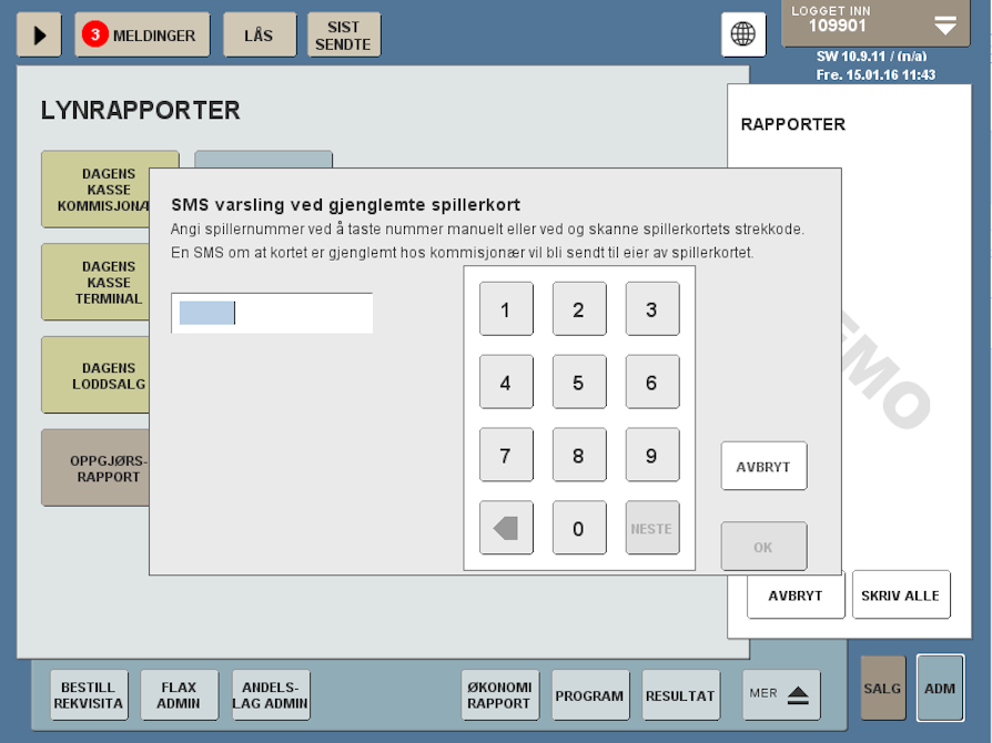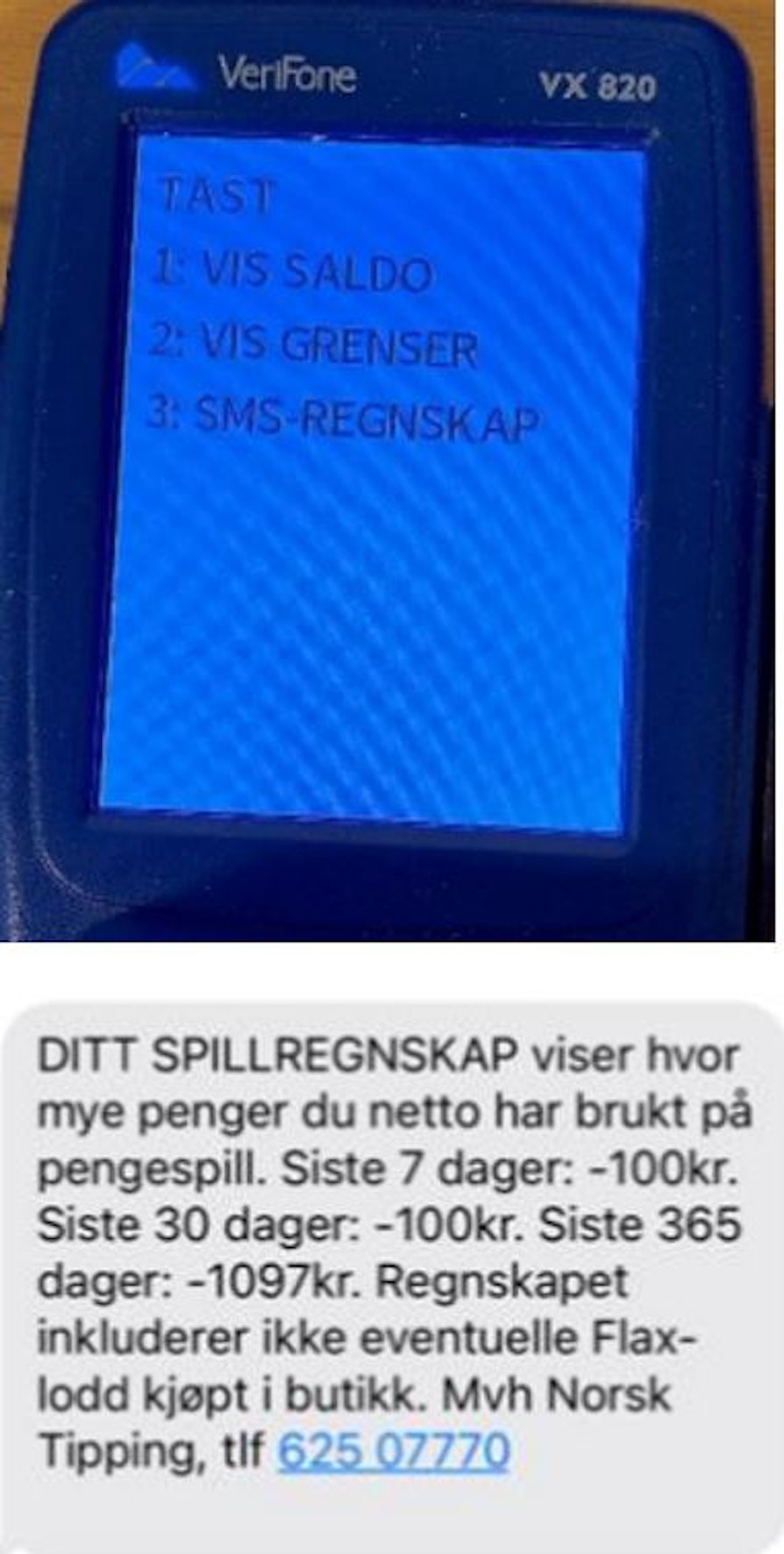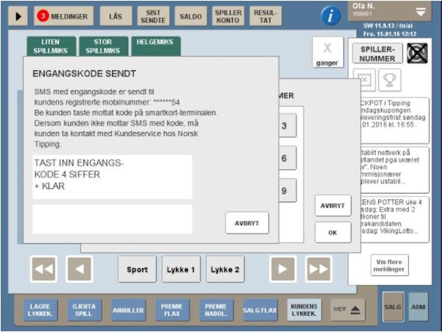 På pinpad vil det være tre valgmuligheter, Vis saldo, vis grenser, SMS-regnskap. Ved å taste tallet 3 vil kunden sende sitt personlige spillregnskap til seg selv på SMS.