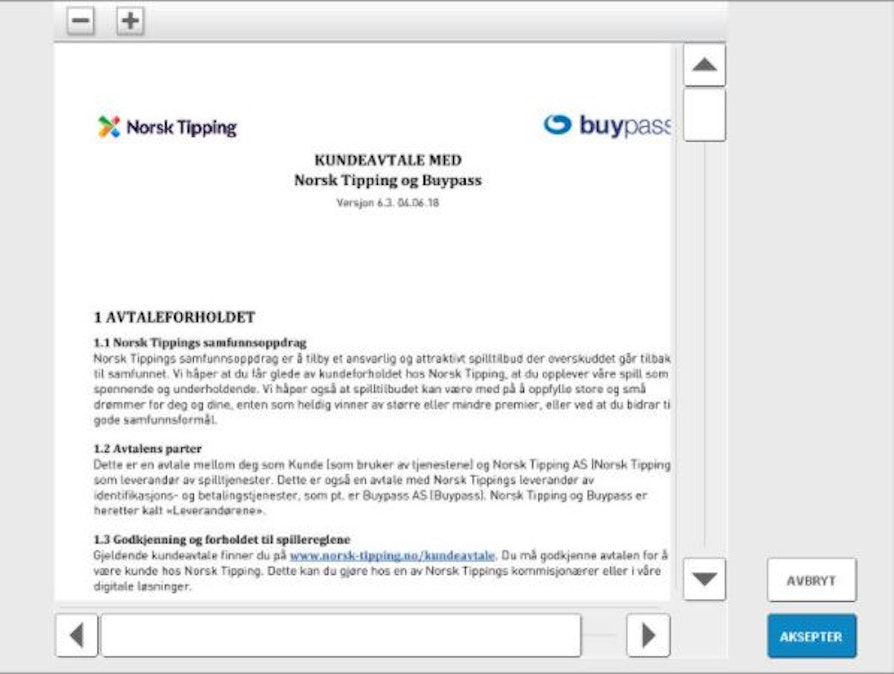 Deretter må du som operatør skrive inn din PIN-kode. Gi et nytt spillekort til kunden som kan sette kortet i smartkortleseren og kunden taster inn sin egen PIN-kode 2 ganger.Nå kommer kundeavtalen opp på kundeskjermen som kunden skal lese og akseptere ved å trykke på “aksepter” nederst til høyre på kundeskjermen.