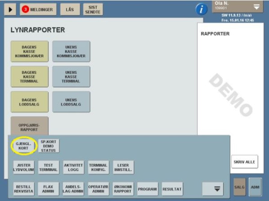 Fra utvidet ADM-meny kan du velge GJENGL. KORT (gjenglemt kort) ved å velge ADM - MER og skanne strekkoden på baksiden av kortet. En SMS med informasjon om hvor kortet befinner seg sendes til kunden. Spillerkort som ikke hentes etter gjentatte SMS-meldinger, skal sperres og makuleres.