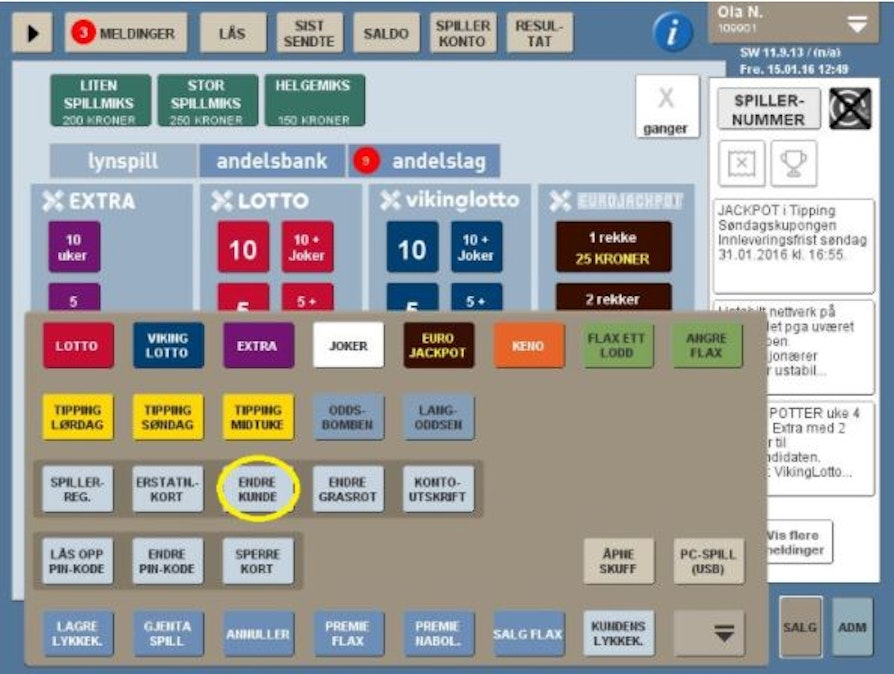 Spillerkortet må stå i smartkortleseren. Velg ENDRE KUNDE fra utvidet salgsmeny. Kunden må taste inn sin PIN-kode. Du kan endre bankkontonummer, telefonnummer og samtykke til informasjon fra Norsk Tipping. Følg anvisning på skjermen.