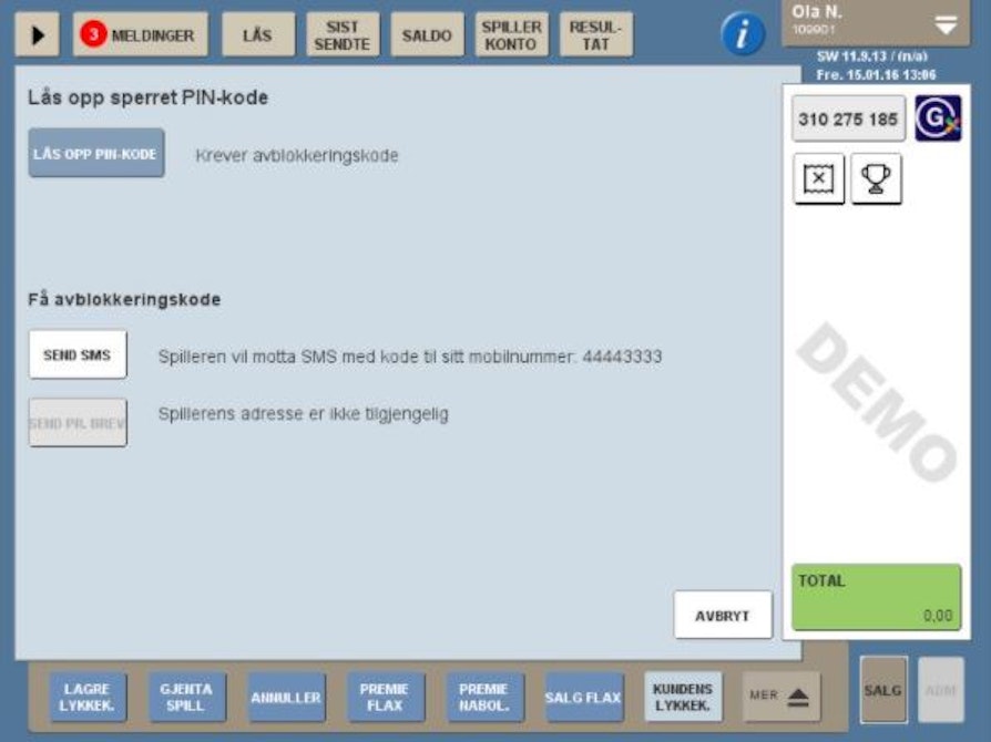 Spillerkort må stå i smartkortleseren. Velg ENDRE PIN-KODE. Kunden må taste inn sin PIN-kode eller bruke avblokkeringskode. Avblokkeringskode kreves dersom kunden har tastet feil PIN-kode tre ganger, eller har glemt sin gamle PIN-kode. Dette hjelper du enkelt kunden med ved å be om avblokkeringskode, enten via SMS eller sendt per brev. Se bildet.