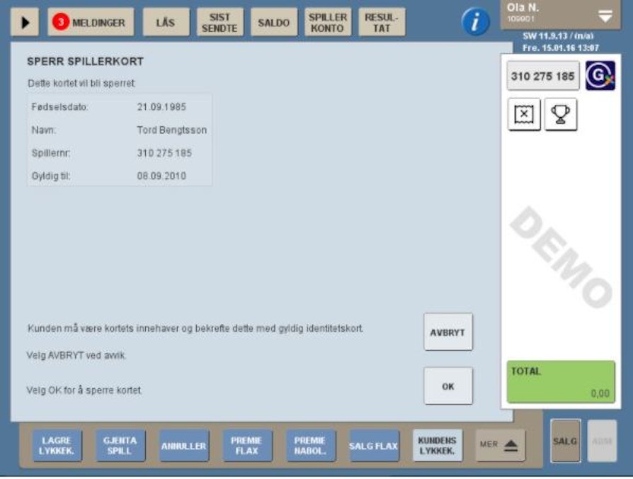Velg SPERRE KORT fra utvidet salgsmeny, og søk på fødsels- eller spillernummer. Et sperret kort kan ikke åpnes igjen! I dette skjermbildet kan du også se hvor lenge Spillerkortet er gyldig.