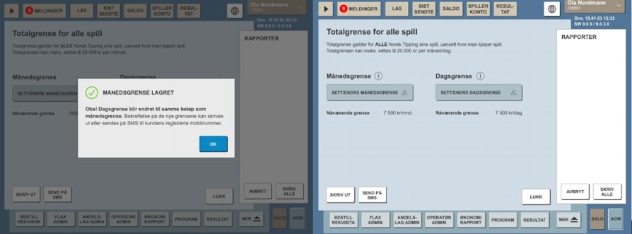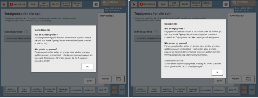Det er viktig for oss i Norsk Tipping at dere kommisjonærer hele tiden har den informasjonen de trenger tilgjengelig der de opererer. Vi har derfor valgt å sette inn et informasjonsfelt dersom dere skulle komme i den situasjon hvor det er behov for informasjon om de ulike grensene. Dere kommer til informasjonen ved å klikke på infoknappen ved siden av Månedsgrense/Dagsgrense. Informasjonsfeltet for dag- og månedsgrense ser slik ut: