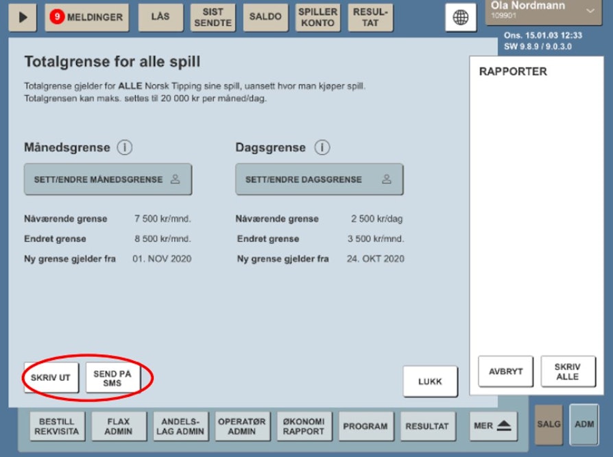 Når grensen(e) er satt, vil det være to valgmuligheter for kvittering -> «Skriv ut» eller «Send på SMS».