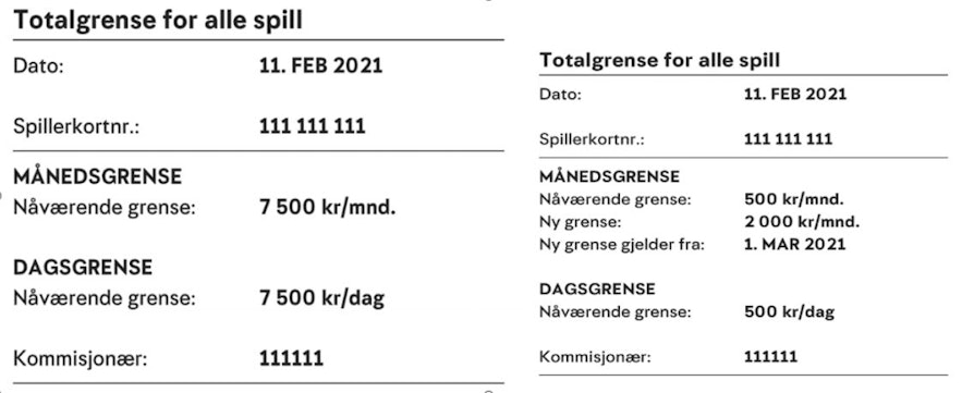 Når kunde har satt grense vil meldingen under vises for kommisjonær, og siden for totalgrense bli endret (meldingen er i tilfeller hvor kunde ikke har satt grenser fra før):