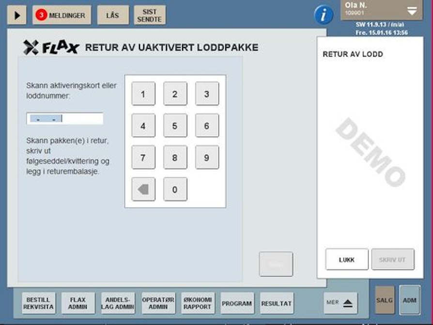Viktig å alltid aktivere en loddpakke før du begynner å selge av den! Dette MÅ gjøres på terminalen (ikke i egne kassasystemer). Gå inn i Flax-administrasjon og velg AKTIVERE LODDPAKKER og skanne den lange strekkoden bak på loddet.