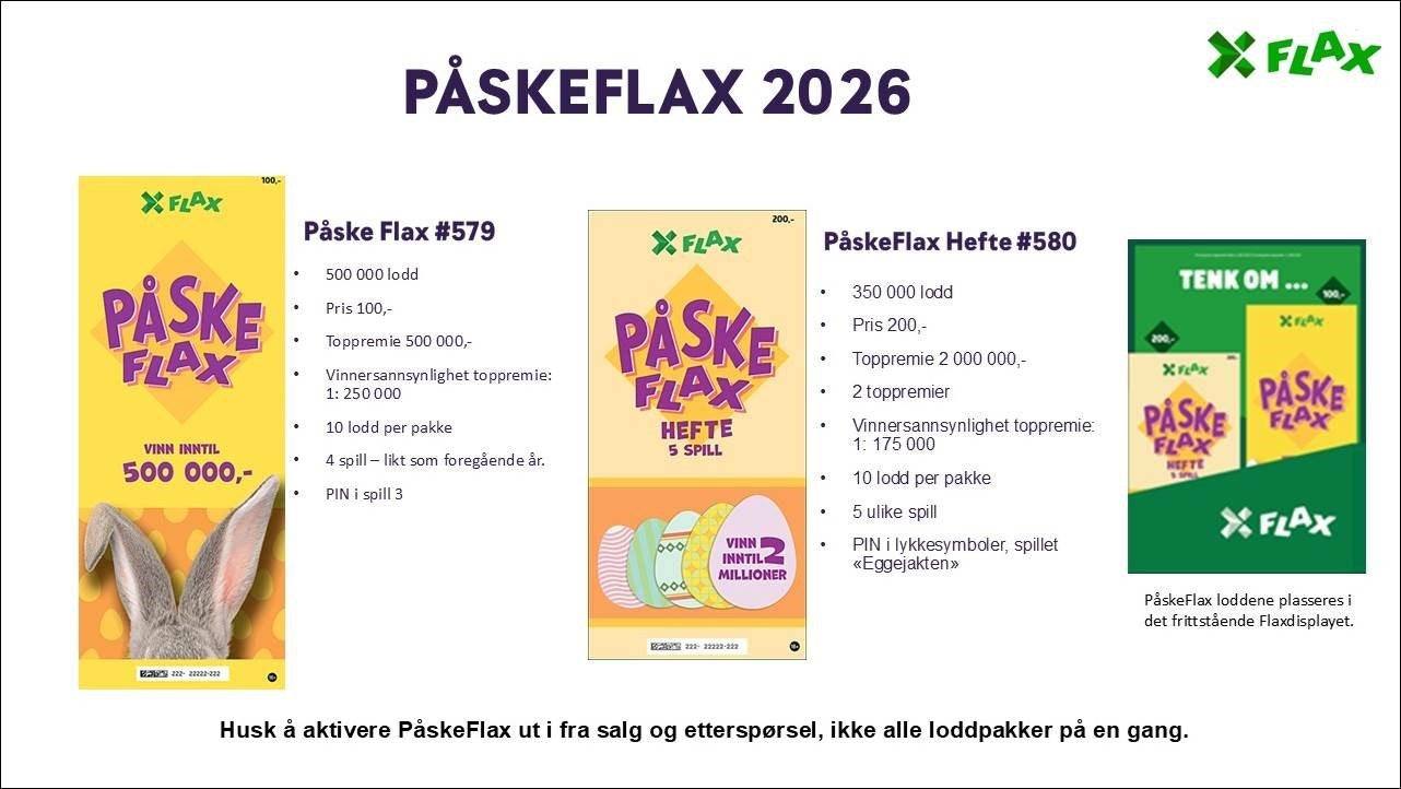 PåskeFlax #579 til kr. 100,- og PåskeFlax hefte #580 til kr. 200,- er nå på vei ut til dere. Begge lodd kan aktiveres, og settes frem for salg i det frittstående Flax displayet så snart dere har mottatt dem.