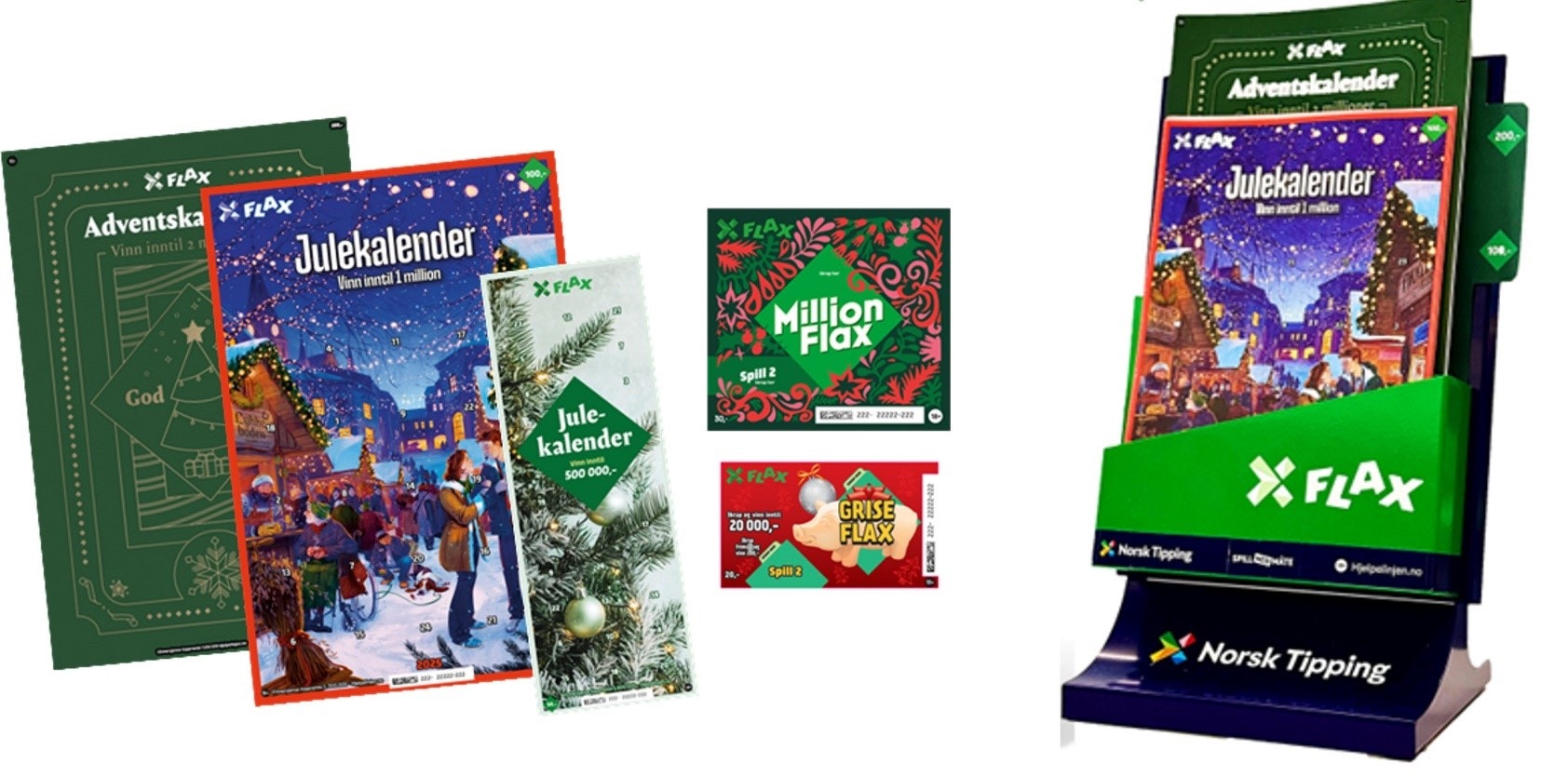 Flax julekalender #573 til kr. 50,- og GriseFlax #575 er nå på vei ut til dere. Begge loddserier kan aktiveres, og settes frem for salg i Flax dispenseren så snart dere har kjørt mottak på loddforsendelsen.
