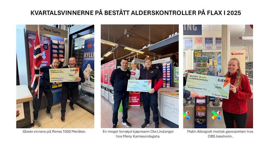 Vi vil også trekke ut kvartalsvinnere i hele 2026, og for å ha mulighet til å vinne gavesjekk på kr. 5 000,- må dere bestå alderskontrollen. Husk derfor å be om legitimasjon dersom dere er i tvil om Flax-kunden er under 25 år.