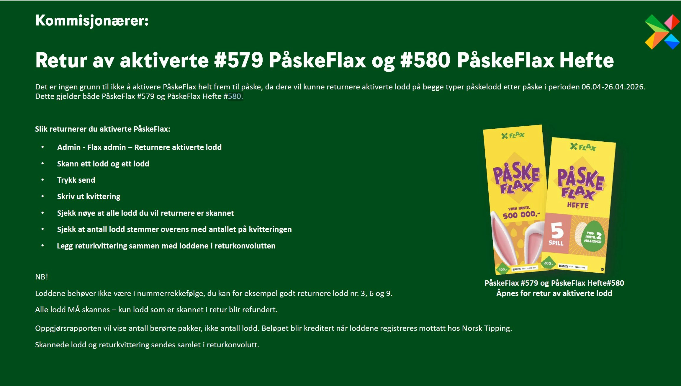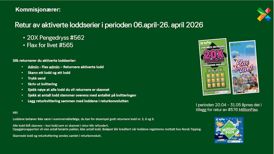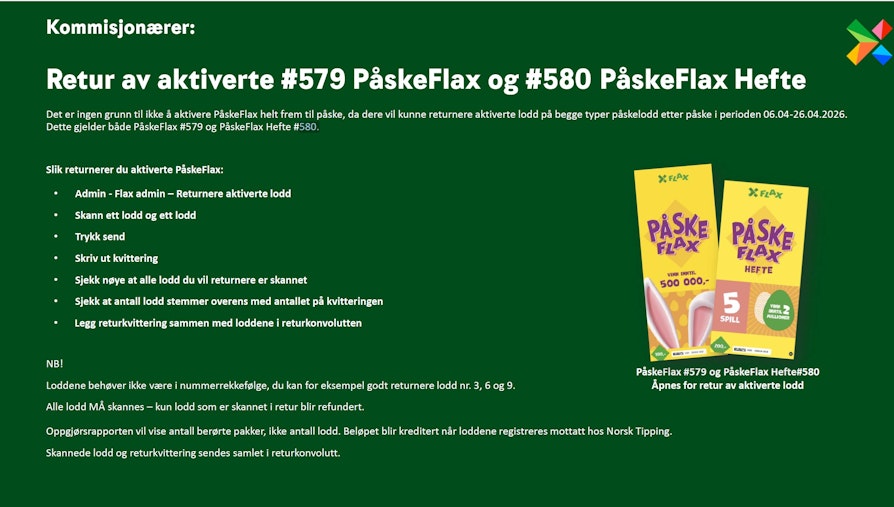 Minner om at dere kommisjonærer har mulighet til å sende i retur aktiverte PåskeFlax #579, PåskeFlax hefte #580, 20XPengedryss #562 og Flax for livet #565. frem til og med 26. april 2026.