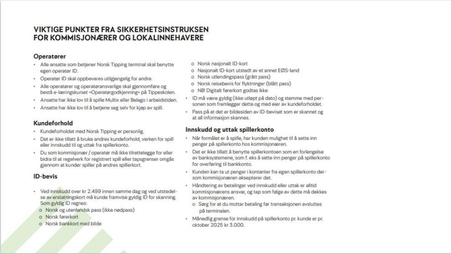 Vi sender nå ut et brev til dere alle kommisjonærer og lokalinnehavere med en tosidig A5 plakat, hvor vi har fokus på de viktigste punktene i Sikkerhetsinstruksen for kommisjonærer/lokalinnehavere og operatørgodkjenningskurset. Sikkerhetsinstruksen dere har liggende i plastlommen i terminalen skal kastes, og erstattes med denne nye A5 plakaten.
