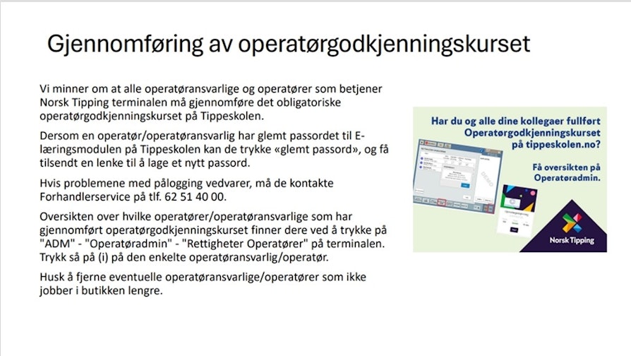 På motsatt side av plakaten finner dere informasjon om det obligatoriske operatørgodkjenningskurset som skal gjennomføres av alle operatøransvarlige og operatører som betjener Norsk Tipping terminalen.